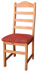 Krzesło z drewna sosnowego. Nogi tylne profilowane, oparcie tylne ze szczebli drewnianych. Siedzisko tapicerowane lub drewniane do wyboru. Krzesło wygodne, ergonomiczne, doskonale nadające się do kuchni, pubu czy restauracji.